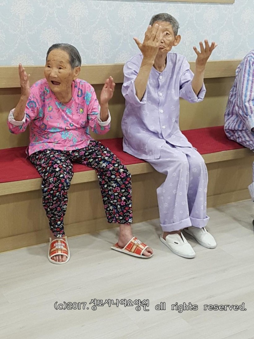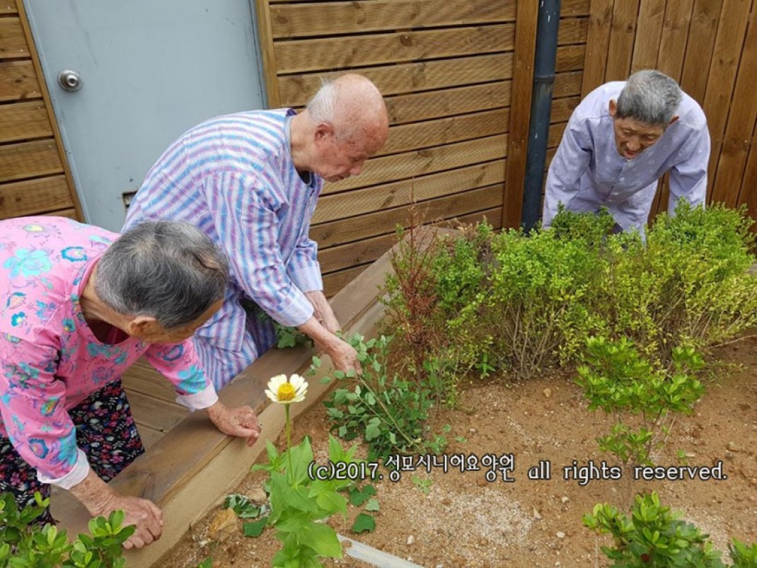 주말 아침 가벼운 체조 후, 하늘정원에 나가셔서 산책과 채소를 가꾸시는 어르신들이십니다